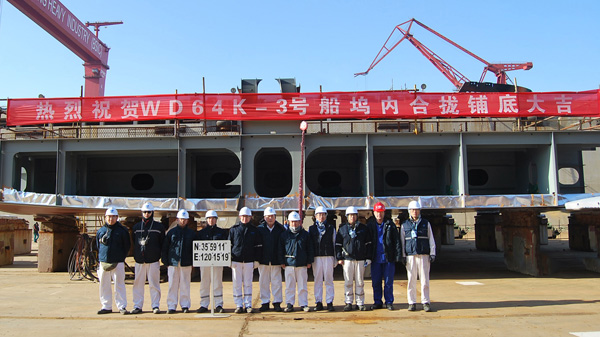 2018年12月28日上午,公司承接的出口項目?C?C6.4萬載重噸木屑運輸船3號、4號船,在2號造船塢內(nèi)先后實現(xiàn)合攏鋪底。至此,公司承建的4艘6.4萬載重噸木屑運輸船已全部按照生產(chǎn)節(jié)點計劃順利推進(jìn)。公司副總經(jīng)理周向陽和船東代表及相關(guān)監(jiān)造人員、驗船師,NK船級社代表以及公司相關(guān)部門負(fù)責(zé)人出席了鋪底儀式。