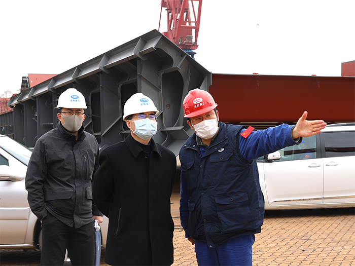 焦明偉一行先后到修船碼頭、造船2號塢等進行實地調(diào)研,了解了公司目前的生產(chǎn)經(jīng)營情況、優(yōu)勢船型、發(fā)展規(guī)劃及存在的困難等。對公司的防疫防控情況和復工復產(chǎn)工作給予了肯定,并協(xié)調(diào)相關(guān)部門解決公司的現(xiàn)實困難。