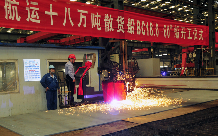 圖為北船重工為中國(guó)航運(yùn)公司建造的首制18萬(wàn)噸散貨船正式開(kāi)工。