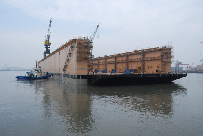 4月20日上午,公司為美國BAE公司建造的55000長噸舉力浮船塢(FDD55K-1),在順利完成船體建造工程后離開1號造船塢靠泊造船3號碼頭。該浮船塢由美國ABS船級社負(fù)責(zé)監(jiān)造,工藝標(biāo)準(zhǔn)要求嚴(yán),施工難度大,其工期直接影響到公司造修船生產(chǎn)資源結(jié)合平衡的總體計劃。為此,公司各相關(guān)部門高度重視,按照節(jié)點(diǎn)計劃落實(shí)細(xì)節(jié),確保各個生產(chǎn)節(jié)點(diǎn)按計劃完成。該浮船塢靠泊碼頭后,將進(jìn)行艙室涂裝、系統(tǒng)安裝調(diào)試等工作,計劃5月中旬進(jìn)塢完成船體噴漆等工程,7月份完成出海沉浮試驗(yàn),8月份交船。