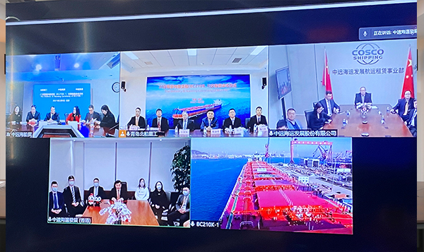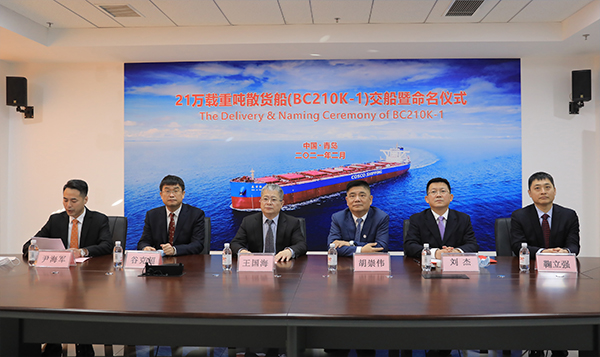 2月8日上午,公司和中船貿(mào)易作為聯(lián)合賣(mài)方為中遠(yuǎn)海運(yùn)發(fā)展股份有限公司建造的首艘21萬(wàn)噸散貨船“惠吉?!陛嗧樌桓叮鞣酵ㄟ^(guò)視頻形式在香港、上海、北京、青島四地舉辦了“云交船”儀式。儀式由公司經(jīng)營(yíng)部部長(zhǎng)尹海軍主持,公司董事長(zhǎng)王國(guó)海、中遠(yuǎn)海發(fā)航運(yùn)租賃事業(yè)部總經(jīng)理李兵先后致辭,中遠(yuǎn)海發(fā)航運(yùn)租賃事業(yè)部黨總支書(shū)記蔣仲、中船貿(mào)易船海(北京)項(xiàng)目部副總經(jīng)理孫勇、北船重工常務(wù)副總經(jīng)理劉杰代表三方簽署了交船議定書(shū)。中國(guó)遠(yuǎn)洋海洋大學(xué)培訓(xùn)教學(xué)部部長(zhǎng)陳愛(ài)玲教母在現(xiàn)場(chǎng)為船舶命名、砍纜。