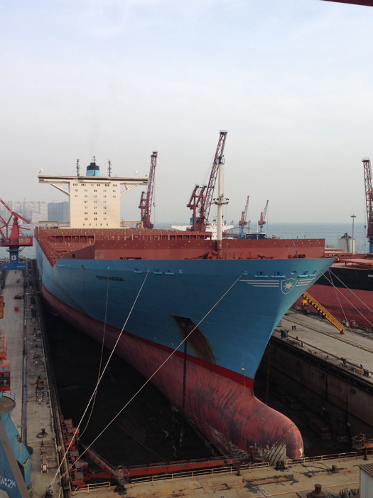 “伊迪絲馬士基”輪總長397.7米,船寬為56.4米, 此次進廠屬常規(guī)塢修。本次該輪所進的修船2號塢長度為405米、寬度為58米,為保證艉軸工程施工需要,修船分廠船塢車間在布墩工藝設(shè)計上做了大膽的突破,船舶進塢落墩后球鼻艏距離南塢墻只有0.4米,船舷距離左右塢墻只有0.8米,進塢難度之大可想而知。對此,修船分廠相關(guān)部門進行了周密的部署和精心準備,確保船舶進塢安全。3月11日早晨6時,該輪完成修理順利離廠。